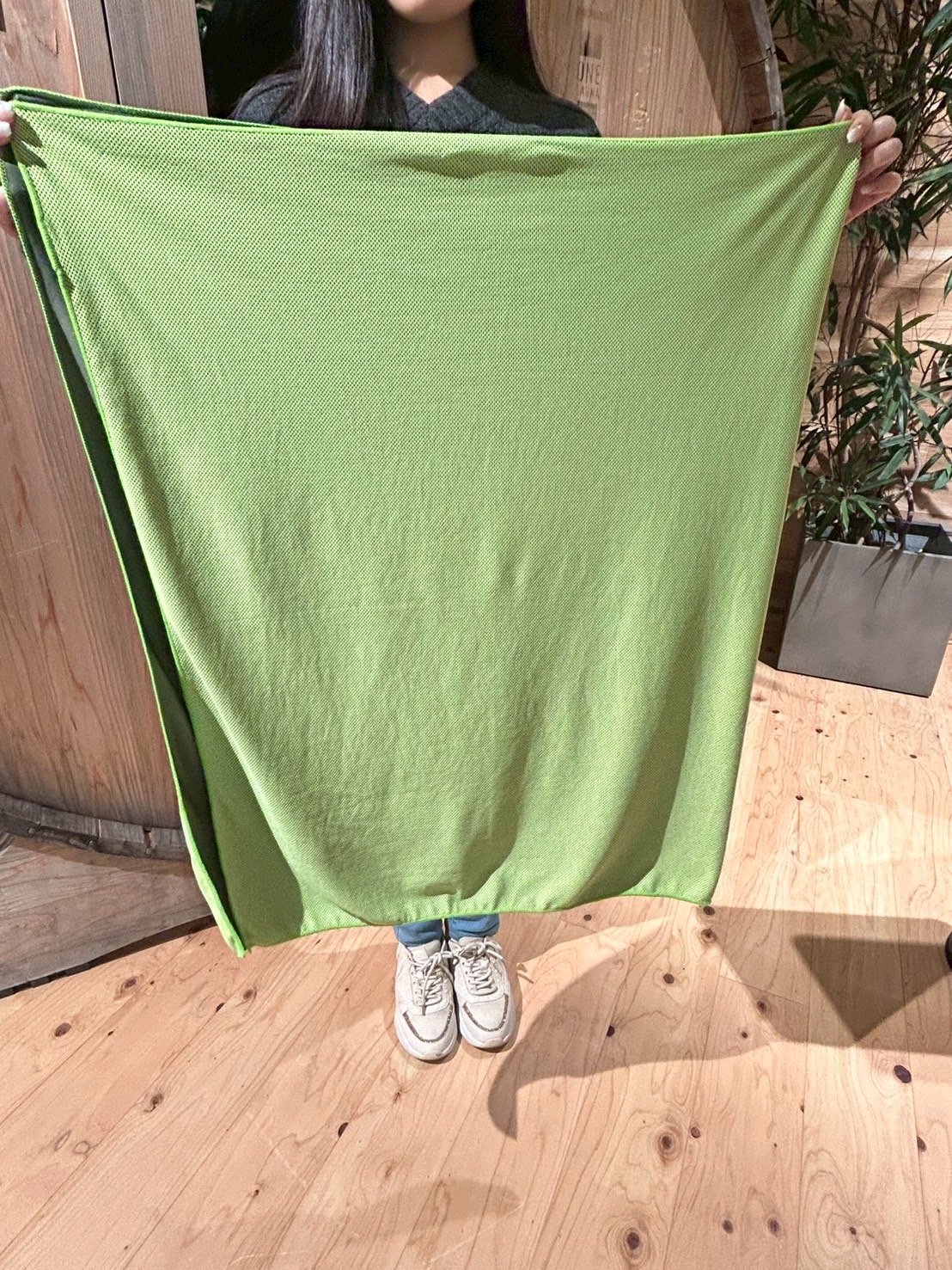 上記以外の特徴として、一般的な冷感タオルのサイズにはない、たて1280×よこ750 mm の特注大判仕様になっている事から、冷却範囲が多くなり短時間で冷却効果が体験できます。